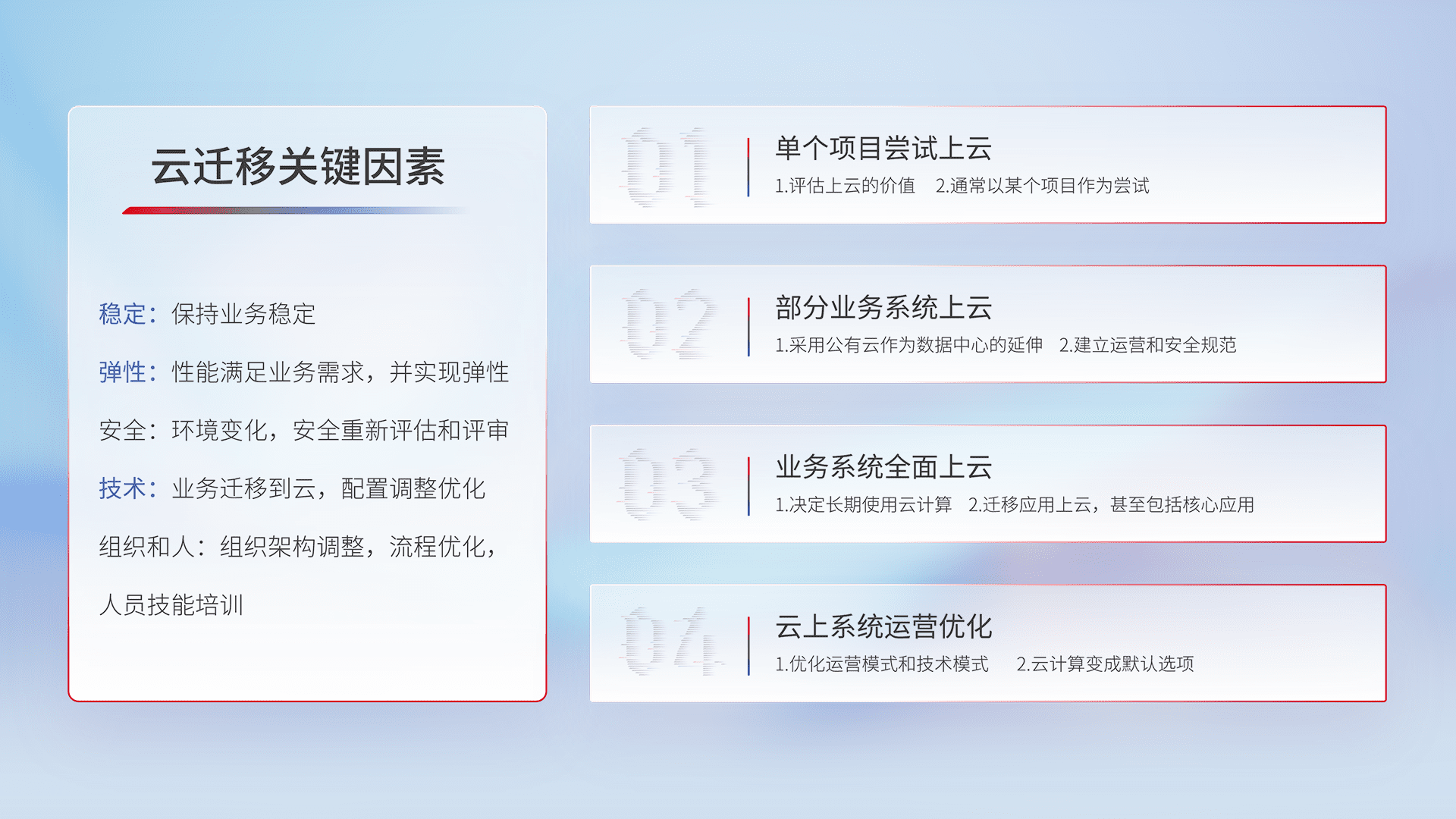 结合实际业务,,,从规划设计、、、云平台选型、、、云原生改造、、、数据迁移、、集成交付,,,,迁移全过程为客户识别最佳上云路径,,做好风险识别管理,,,设计网络架构、、身份权限、、安全审计合规、、操作审计、、、日志审计、、、监控告警策略、、、多站点容灾设计等,,,对云上基础设施进行整体规划,,提升IT治理水平,,,,以满足弹性、、、高可用、、、、高性能的需求。。。。