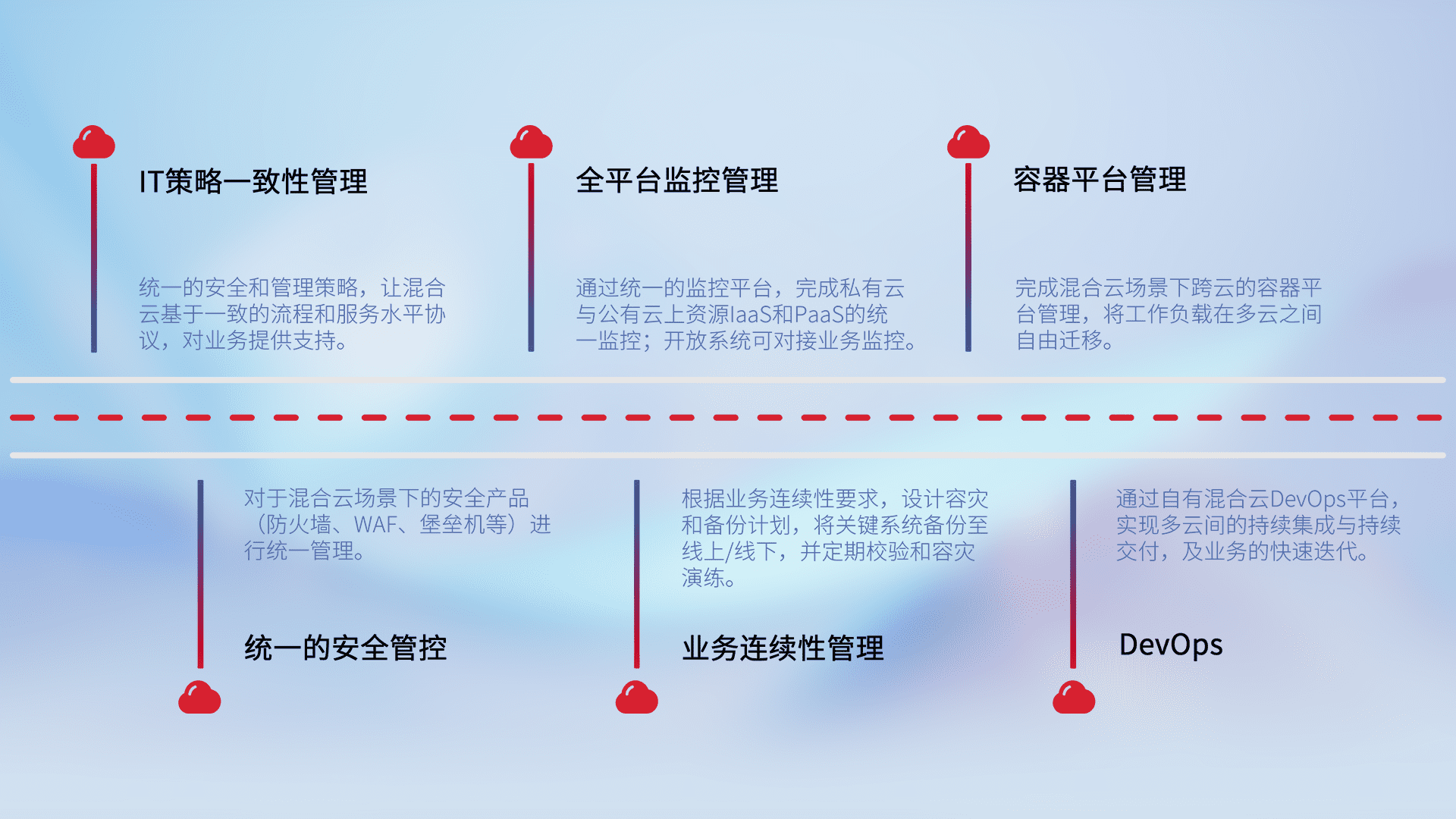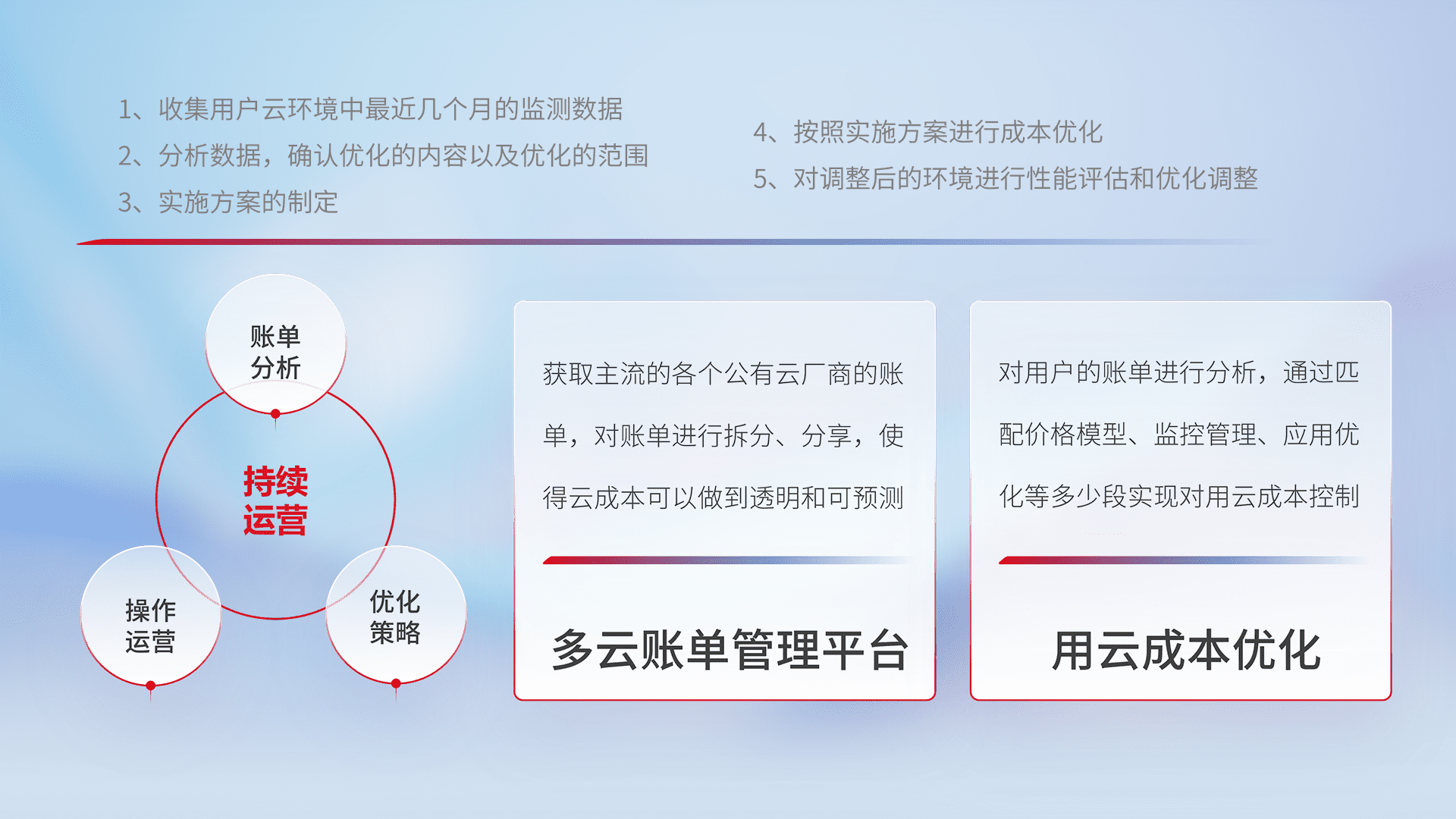 通过多云纳管,,,以统一的资源数据模型把客户的云资源进行抽象和封装,,,进而实现对多云资源的统一操作,,,,保障云资源管理的可靠性、、、稳定性与可用性。。量身定制化运维内容,,,,配置、、、开发运维、、、、补丁管理、、备份、、监控、、认证和访问管理、、、、审计和日常巡检等,,保障在用云过程中的可靠度,,,稳定度以及高可用率。。。