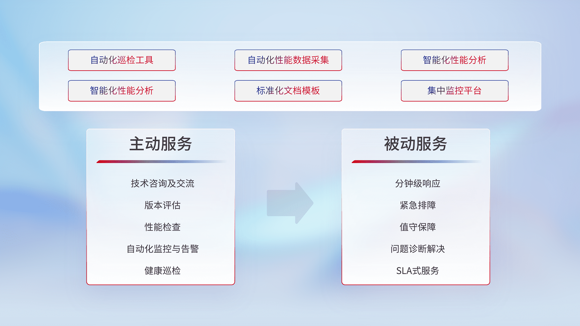 智能化工具和标准化文档,,保障服务质量,,,,提供主动服务(包含技术咨询、、、版本评估、、、性能检查、、自动化监控与告警、、、健康巡检)和被动服务包含(分钟级响应、、紧急排障、、、、值守保障、、、问题诊断解决、、、、SLA服务)。。