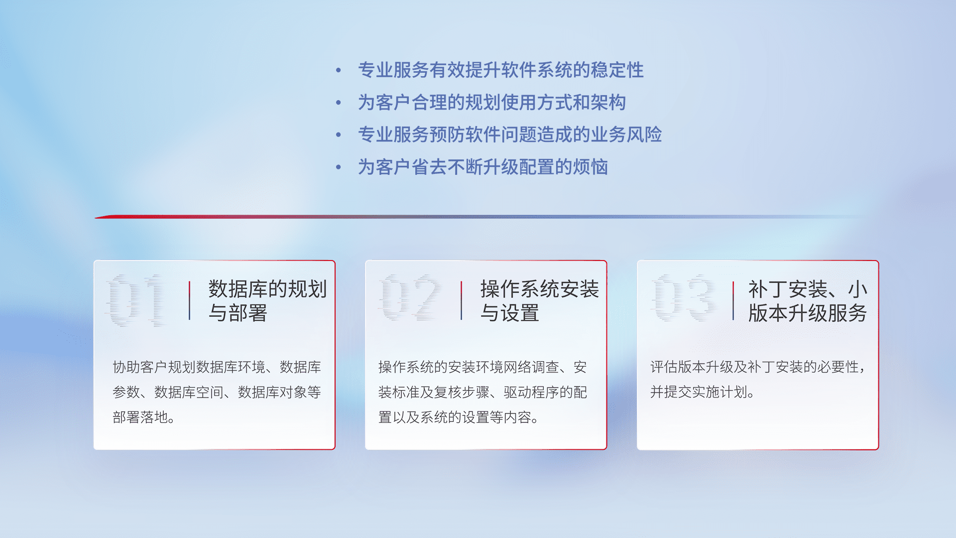 为客户提供软件规模升级、、、快速部署、、、、按需配置的专业服务,,,从数据库的规划与部署到操作系统的安装与设置,,,,再到补丁安装和小版本升级提供支持。。。。